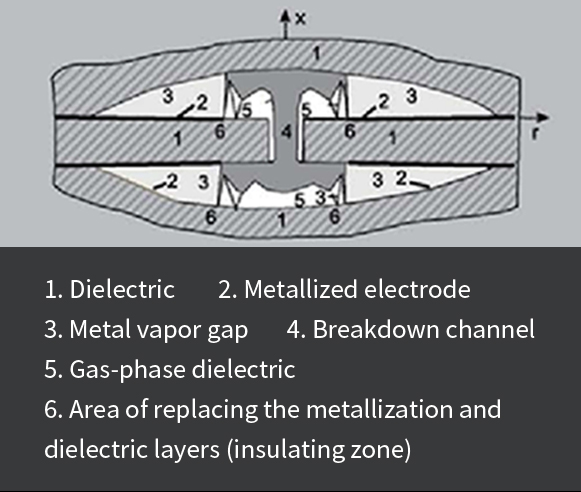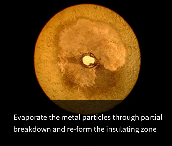 Capacitor winding dielectric is made of gradient metallized polypropylene film. It evaporates metal particles through partial breakdown and re-form the insulating area, so that the capacitor isolates the fault point on its own and continues to work normally, achieving the self-healing function. At the same time, the capacity loss due to breakdown is negligible and does not affect the normal operation of the capacitor.