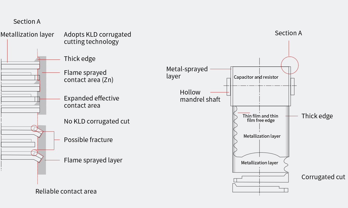 Capacitor adopts film edge thickening reinforcement technology, which can enhance the reliable connection between the gold-sprayed surface and the electrode. The internal film The internal film uses both corrugated and smooth cutting methods, which maximizes the effective surface between the component and the metallization layer and improves surge current suppression capability.
