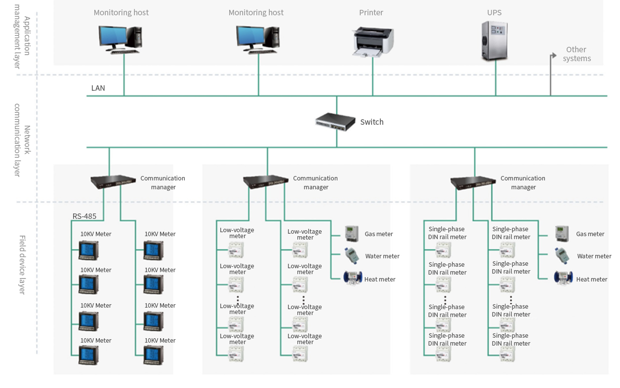 Device layer: it is mainly used for the acquisition and control of data and signal status of field power supply and distribution equipment. The equipment layer consists of various types of high-voltage/low-voltage meters, gas meters, water meters, heat meters and other intelligent terminals used in the monitoring system.