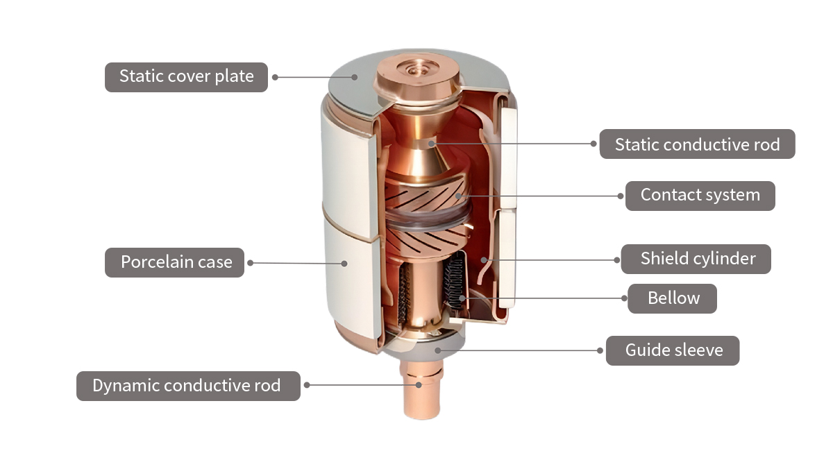 The cup-shaped longitudinal magnetic contatcs are made of high-quality material and have low chopping current value; use the one-time tube sealing and exhausting technique, with high dielectric recovery strength and low air leakage rate; high mechanical strength, long mechanical life; strong making and breaking insulation recovery greatly reduces the reignition and TRV breakdown.