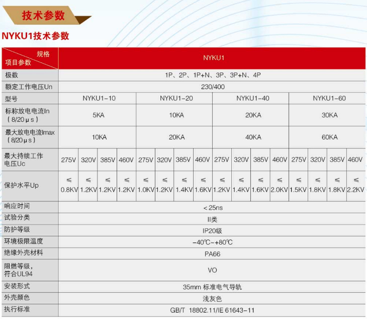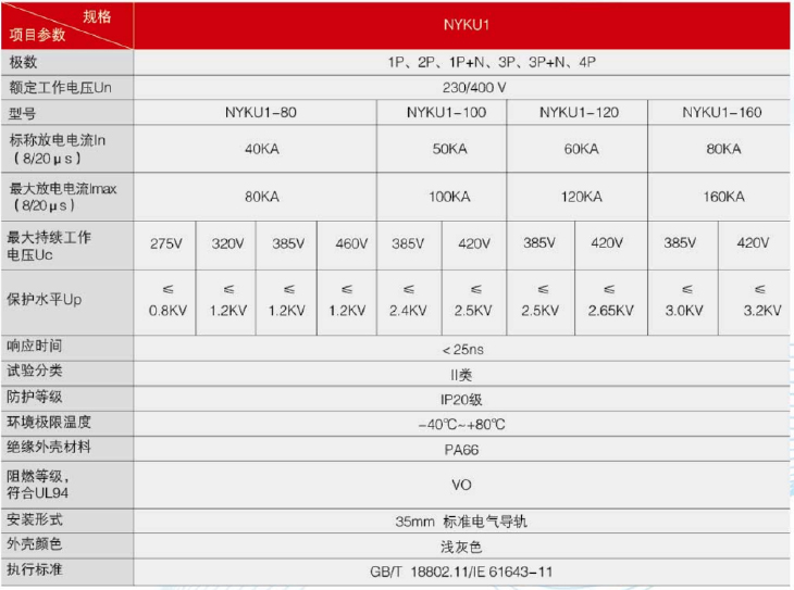 - NYKU1-I系列電涌保護器(SPD),適用于交流50Hz,額定工作電壓230/400V的三相配電系統(tǒng)中,滿足SPD I級試驗,其中沖擊電流峰值50kA(10/350μs),電荷量至20As,抑制直擊雷,感應雷或其它瞬時過電壓,泄放電涌能量,從而保護系統(tǒng)電路和負載設備。適合與其它系列電涌保護器配合,實現(xiàn)層迭式保護體系,使低壓配電系統(tǒng)得到更廣泛更有效的保護。
